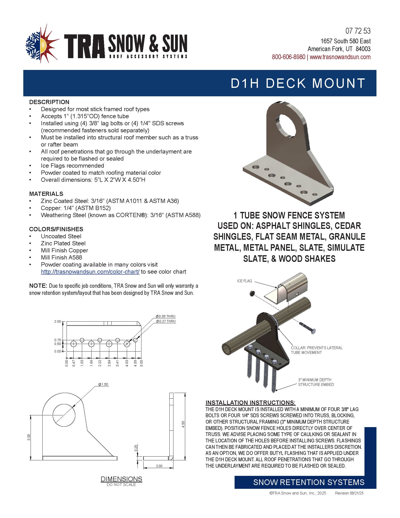 • Installed using (4) 3/8” lag bolts or (4) 1/4″ SDS screws