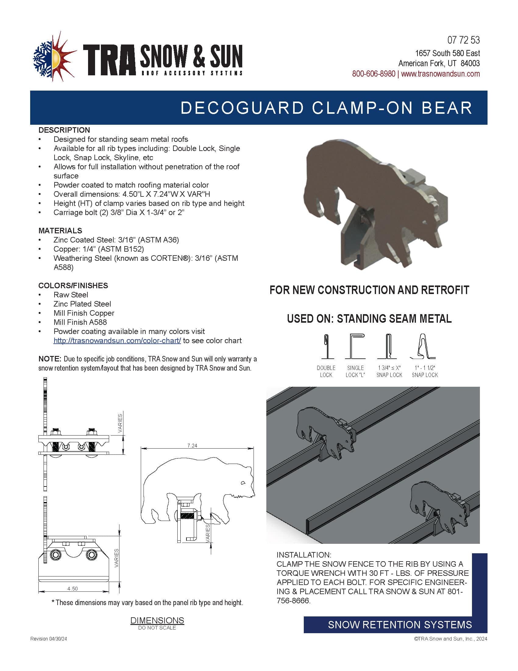At TRA Snow and Sun we engineer and lay out each project free of charge using many factors specific to your roof. We then provide you with the snow retention plan, layout, and product detail. TRA Snow and Sun representatives will work with you to design the most efficient snow retention system. Fill out our Snow Retention Checklist to get started.